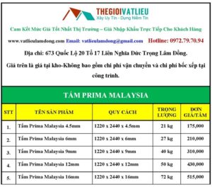 Báo Giá Tấm Prima Malaysia